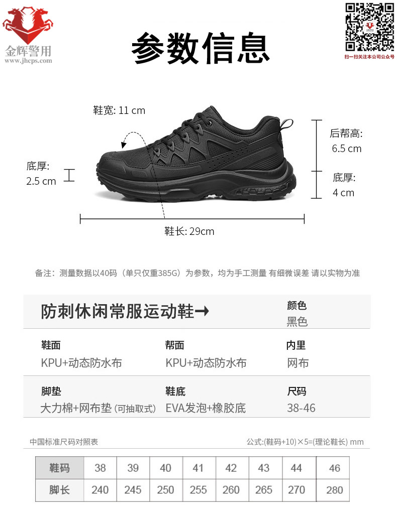 警用百搭休閑運動鞋,適合搭配執勤服或作訓服穿著,長時間穿著不累腳,重量輕便。產(chǎn)品具備防水、防滑、防穿刺(cì)功能,經典係帶(dài)設計,橡膠防滑耐磨大底,耐磨發泡(pào)中(zhōng)底,凱夫拉防穿刺夾層,高彈(dàn)大力棉(mián)鞋墊,鞋麵超遷+防水布,上腳美觀,運動休閑工作三不誤。詳細產品參(cān)數請(qǐng)瀏(liú)覽實物圖說明: