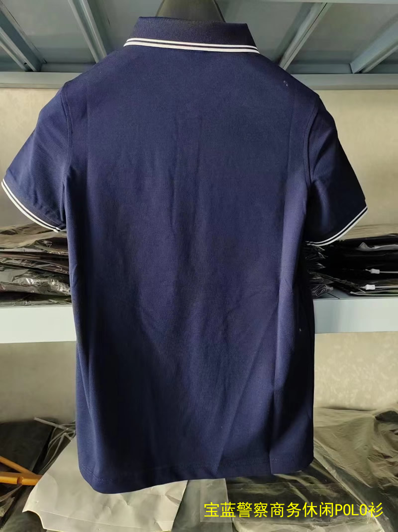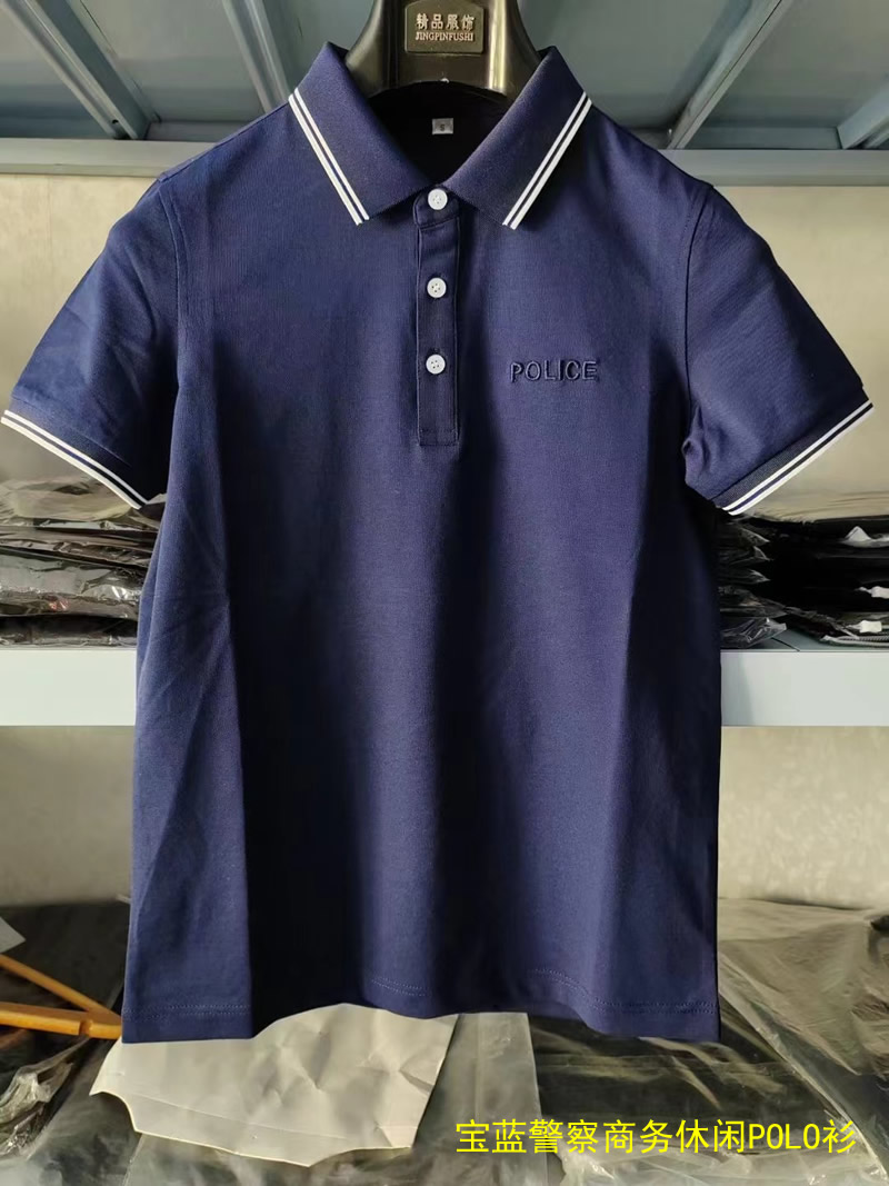 警務(wù)翻領文化(huà)POLO衫,麵料含60%棉,40%桑蠶(cán)絲,寶藍色,精致刺繡警察POLICE字母。商務,休閑,工作三不誤。