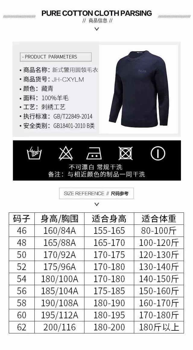 新標警用圓領羊毛衫(shān) 主麵料:100%純羊毛 顏色:藏藍色 自行標準:GB/T22849-2014 技術標準:《中華人民(mín)共和國公共安(ān)全行業標準(zhǔn)》 保養方法: 1、不能機洗,必須手洗,手洗力度一定要(yào)輕柔; 2、盡量減少洗滌次數,使用30度常溫水洗滌,經常洗滌或水溫過熱是造成縮水、氈化、變形的重要原因; 3、水洗時產生的摩擦(cā)會造成毛線起球,應將毛衣翻轉“反麵洗滌”,平攤在盤內,雙手壓洗,減(jiǎn)少洗滌時產(chǎn)生的摩擦; 4、水洗後不能甩幹,應(yīng)該柔擠幹水分,並穩定衫形至原有形態; 5、在(zài)洗衣過(guò)程中建議使用專用的毛線洗滌劑或衣物柔順劑,增(zēng)加毛(máo)衣的耐用性。 6、有條(tiáo)件的建議幹洗,如不是很髒建議少洗。