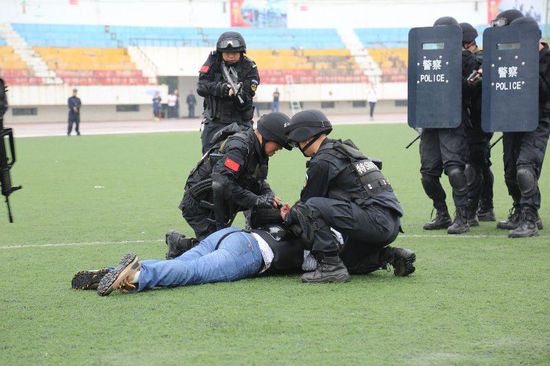 40餘(yú)名學生正在操場上體(tǐ)育課,突然闖(chuǎng)入四名“身份不明”男子,手持砍刀,衝向了正在(zài)上課(kè)的學生,人群陷入混亂和恐慌。民(mín)警立即趕赴現場進行應急處突,並快(kuài)速控製四(sì)名男子,保證了學生的人身安全。5月31日,公安寶塔(tǎ)分局2016年警(jǐng)務實戰封閉訓練匯報表演暨反恐演練(liàn)在(zài)延安大(dà)學操場舉行。