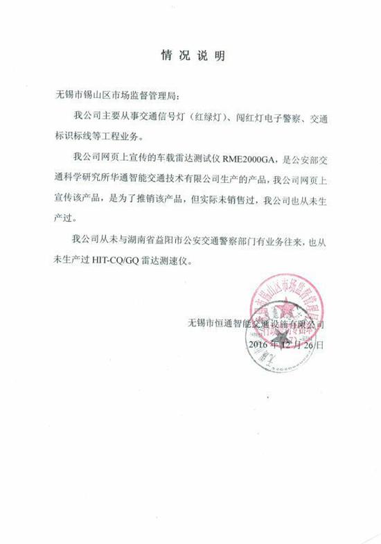 而無錫恒通公司向錫山區市(shì)場監督管理局提供的“情況說明”表明,該公司網頁上(shàng)宣傳的車載雷達測速儀是為了推銷,實際(jì)未(wèi)銷售過,也從未生產過,“也從未生產過HIT-CQ/GQ雷達測速(sù)儀”。該公司相關人士向澎湃新聞證實,他(tā)們並沒有生產雷達測速(sù)儀的許可證。