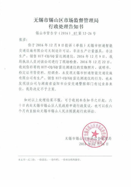 讓人意想不到的是,2016年12月(yuè)26日,該局向張彥寄來了錫山市管告(gào)字(2016)07第12-26號“行政處理告知書”,稱該局執法人員對無錫恒通公司進行了現場檢查,經調查,未(wèi)發現該公司“有生產、銷售HIT-CQ/GQ雷達測速儀的行為”,也未發現該(gāi)公司“與湖南省益陽(yáng)市(shì)公安交通(tōng)警察部門有過業務(wù)來往(wǎng)”。所以,對於張彥投訴的該公司“無許可證非法(fǎ)生產”,決定(dìng)不予立案。