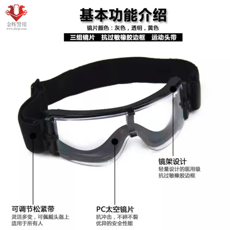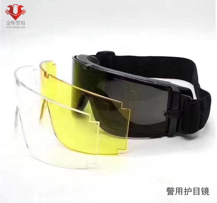 新型特警護目鏡主要是用於保護警務人員外出突發事(shì)件時對眼鏡(jìng)的保護,鏡片(piàn)采用德國拜耳PC片,防劃聚碳酸酯材料,流線型設計(jì),視野清晰,舒(shū)適透(tòu)氣,有效抵(dǐ)抗風沙,防(fáng)護性強.本(běn)中心所供護目鏡,完全依據公安部警用裝備配備(bèi)標準加工並銷售,新式護目鏡配(pèi)置3種不同顏色(sè)鏡片,可以(yǐ)自(zì)由切換。
