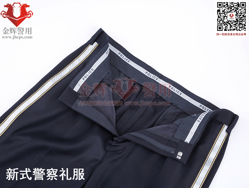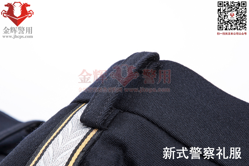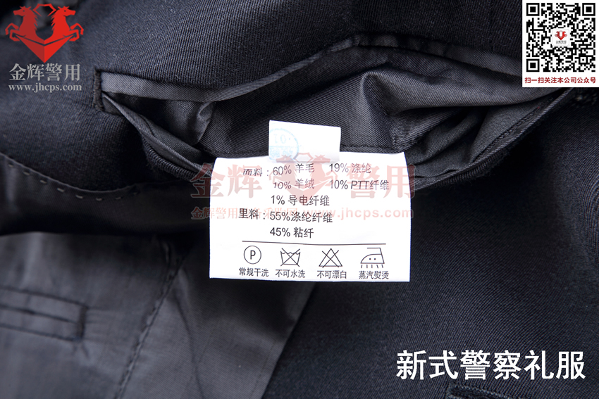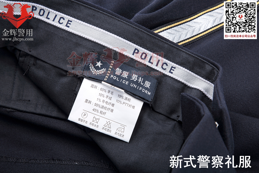 警察禮服上衣和褲子麵料:60%羊毛,19%滌綸,10%羊(yáng)絨,10%PPT纖維,1%導電纖維。