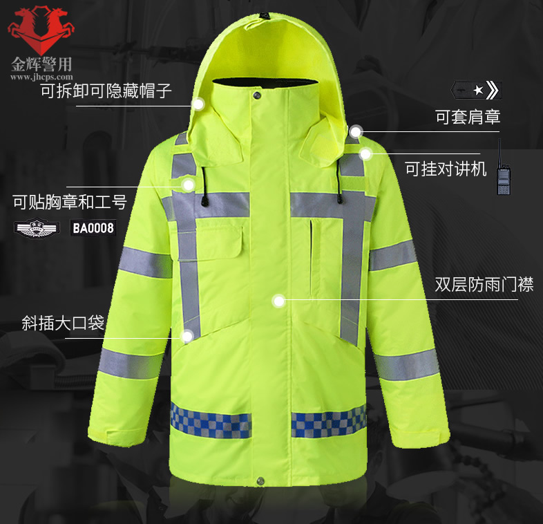特點:高亮反光,多功能設計,帽子和內膽均可拆卸,公(gōng)安部標準產品。