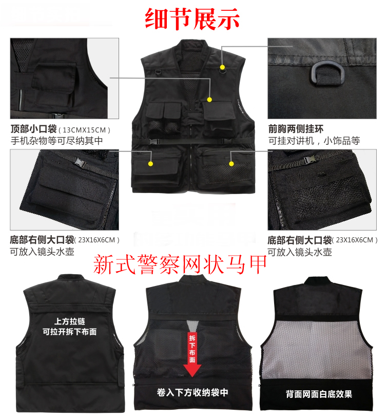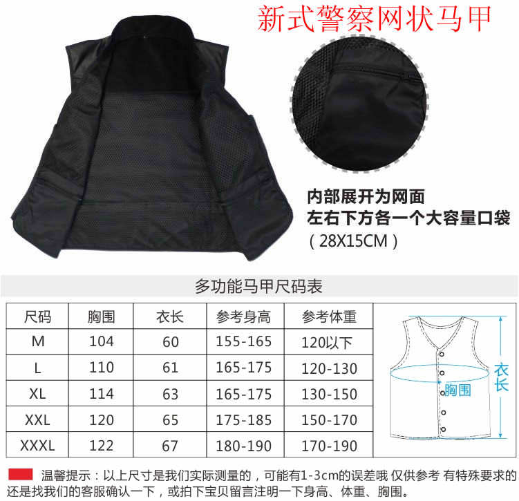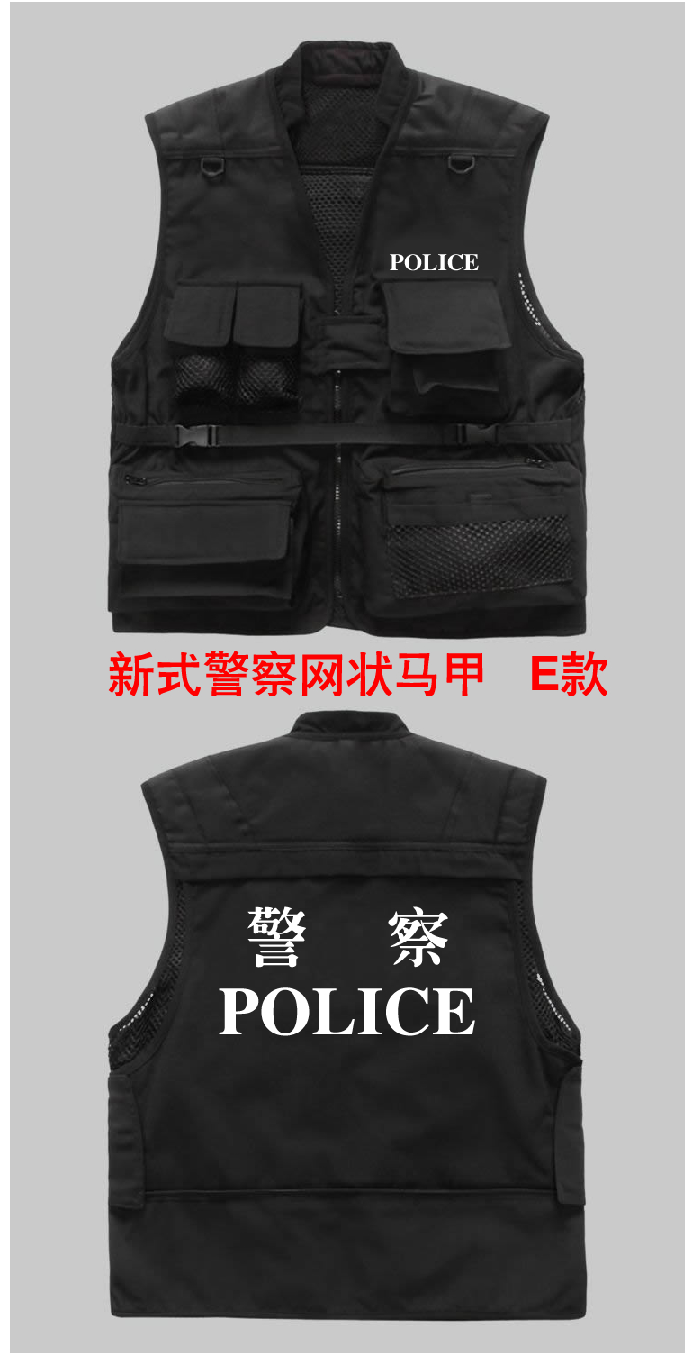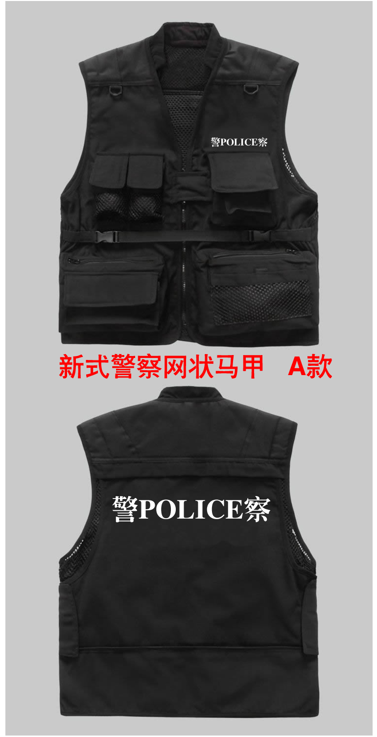 新款警察多功能馬甲為滿足警察(chá)特殊工作需求和展示警察的特殊身份而設計,型號多(duō)種自由選擇,同時可以(yǐ)按各單位要求定做,文字和顏色都可以選擇,同時提供(gòng)反光材料。