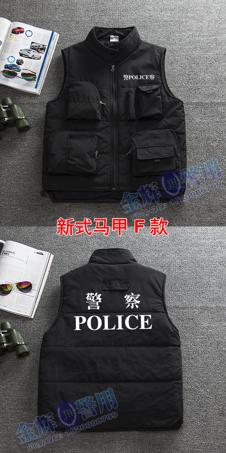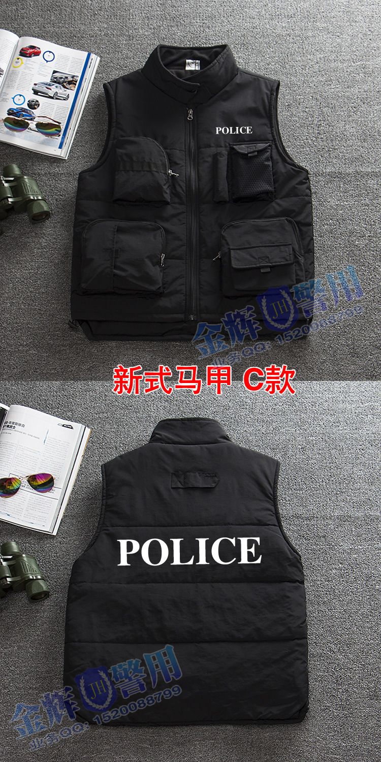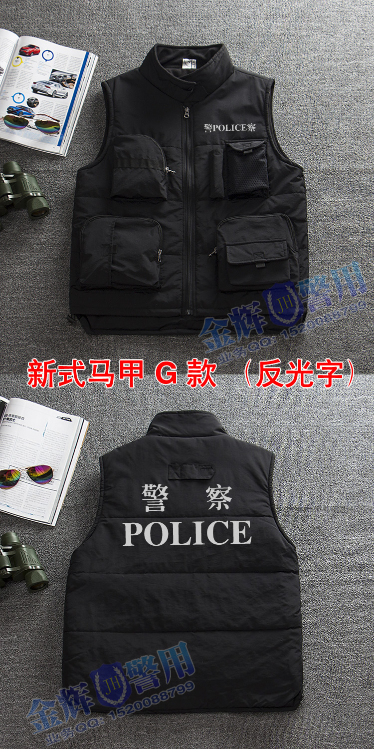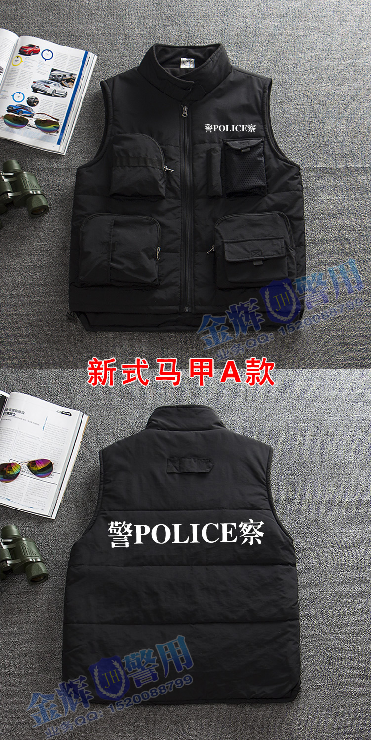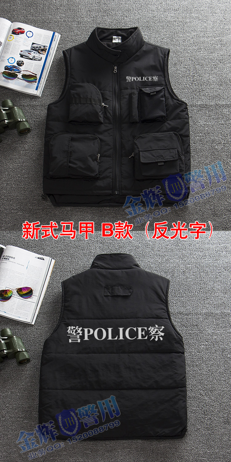 2017新(xīn)款警察便(biàn)裝馬甲款式和原來一樣,隻是(shì)字體不同,同時增加反光字(zì)體(tǐ),麵料材料采用100%防水尼龍,內(nèi)裏滌綸人造棉絨,多口袋設計穿著方便。