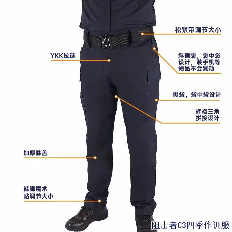 二 麵料輔料 1 、麵料采用(yòng)杜邦(bāng)T400彈力紗,成分為80%滌綸+20%棉、杜邦特氟龍(lóng)三防處理工藝,抗油拒水防汙,士林染色(色牢度可以達到國標4級)。 2、麵料為滌棉大格子款,高強度、高耐磨性、高緯彈,高抗撕裂性能。 3、整套服裝版型為修身款,立體裁剪,提升精氣神,激光切割工藝(yì)提升服裝的整潔度和精準度,褲子(zǐ)拉鏈YKK品牌,左(zuǒ)右褲袢各一(yī)個D型扣,可以(yǐ)掛載各種小物(wù)品。兩(liǎng)個色;黑色,藏(cáng)藍(lán)。