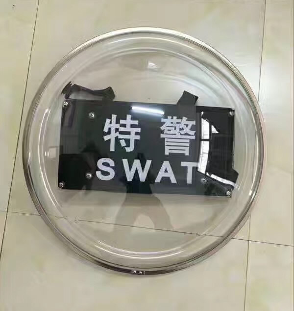 外觀:PC警用防護圓盾牌,盾牌的周邊金屬結構件經過表麵防鏽處理。外(wài)觀光滑,無(wú)可視的凹坑(kēng)、突起、氣泡、毛刺、尖角、劃傷、斑點、脫膠及起皮等缺陷。盾牌正麵上方居中位置標識中文警察和英文大寫黑(hēi)體,文字可根(gēn)據單位要求定做。