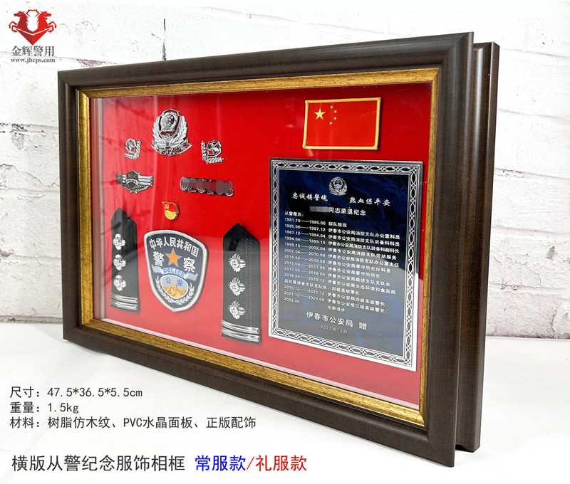 尺寸47.5*36.5*5.5cm 重量:1.5kg 材料為樹脂仿木紋相架(jià),正版警服標誌。