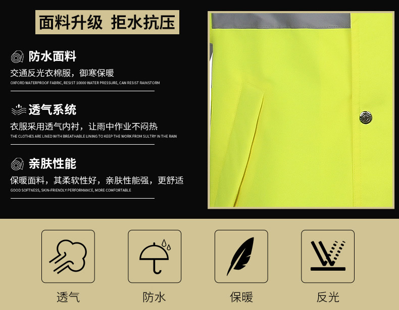 顏色熒光黃,材料為300D防水麵料(liào),方格反光,公安部標準產(chǎn)品。型號齊全。
