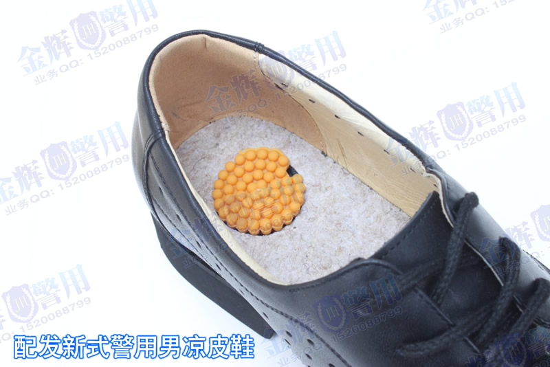 每年(nián)夏季各地(dì)公安單位(wèi)都會采購警用涼皮鞋配發給(gěi)民警使用,警用夏季涼(liáng)皮鞋具有很多特點,第一(yī)是機械打孔,打孔細致不(bú)毛躁,第二是純頭層進口顆粒牛皮,用料講究,第(dì)三做工和細節到位(wèi),手感舒適(shì)。以上三點直接關係到皮鞋的耐用性和檔次 。目前配發的新款警用正品皮鞋都在鞋底底(dǐ)部添加(jiā)了緩壓墊片,下圖黃色位置即是。