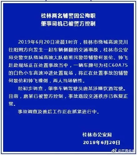 廣西兩交通輔警犧牲 肇(zhào)事司機係酒駕
