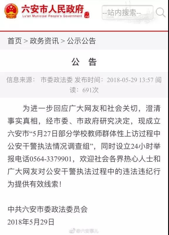 集訪發生後,六安市委、市政(zhèng)府(fǔ)專題研究此事,明確處理意見:一是(shì)成立由市委政法委牽頭、市監察委及相關(guān)部門組成的調查組,對此次集訪處置過程中的問題進行調查,調查工作正(zhèng)在進行中(zhōng)。若發現(xiàn)公安民警在執(zhí)法(fǎ)過程中存在違紀違法行為,將嚴肅執紀問責,決不(bú)姑息袒護。二是市、縣領導深入全市所(suǒ)有中小學開展大走訪活動,了解教師(shī)工作、生活情況,及時研究解決學校和教師提出的有關問題。今天上午(wǔ),調研走訪活動已全(quán)麵展開。
