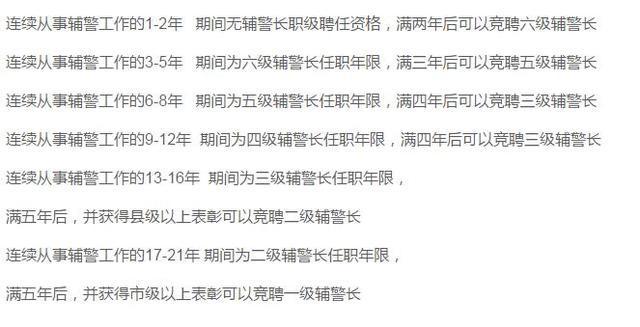 按照(zhào)上麵這個晉升年限來看,我們從一個具有大專以上學曆的人進入公安機關從事輔警工(gōng)作的第一年開始計算,假定(dìng)其每次工作滿晉升年限後都能通過考核順利晉升,再排除(chú)或得獎勵提前(qián)晉升的情況,按照其工作年限筆者劃(huá)出以下無晉升間隔的純理論晉升時(shí)間(jiān)表(biǎo)給予晉升定職參考對照: