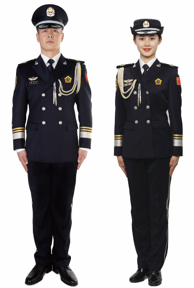 據了解,警禮(lǐ)服設計突出(chū)了禮儀性(xìng)、協(xié)調性和經濟性三個特點,麵料顏色采用藏(cáng)藍色(sè),莊重沉(chén)穩,款式為禮儀性強的雙排六粒扣西服樣式,采用了男女不同的版型,大方得體、鬆緊有度,很好地體現了人民警察的颯爽英姿。