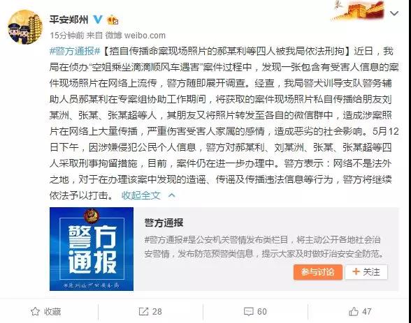 #警方通報#【擅自傳播命案現場照(zhào)片的郝某利(lì)等(děng)四人被我局依(yī)法刑拘】近日,我局在偵辦“空姐(jiě)乘坐滴滴順風車遇害”案件過程中,發現一張包含有受害人信息的案件現場(chǎng)照片在網(wǎng)絡上流傳,警方隨即展開調查。經查,我局警犬訓導支隊警務輔助人員郝某利在專案組協助工作期(qī)間,將(jiāng)獲取的(de)案件現場照片私自傳播給朋友劉某洲、張某、張某超等人,其朋友又將照片轉發至各自的微信群中,造成涉案照片在網絡上大量傳播,嚴重傷害受害人家屬的感(gǎn)情,造成惡劣的社(shè)會影響。